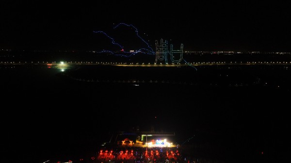 亥时整,北斗星忽然坠入湖心——原是无人机矩阵开始了苍穹作画。羲皇八卦在云端旋转,泥泥狗驮着祝福跃上星河,老子骑牛的身影与集装箱轮在夜空相遇。当三川交汇图案与周口元素在夜空中绚丽绽放时,整座游园爆发出雷鸣般的喝彩。