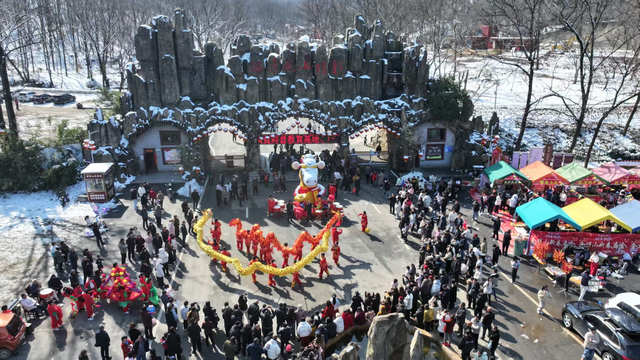 皇家驿站景区内舞龙舞狮队伍活力登场,现场群众驻足观看。(陈华军摄)