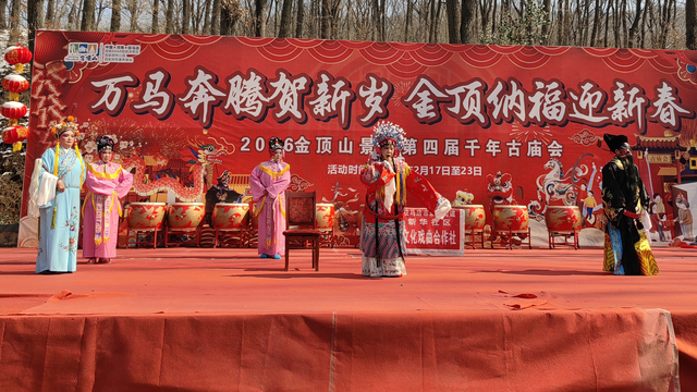 金顶山第四届千年古庙会上,传统戏曲演员盛装登台,共贺新春佳节。(张玉霞摄)