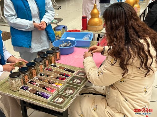 本草雅趣与手工体验交融,成为市集一大亮点。中药合香珠DIY区内,药材标本整齐陈列,专业人员现场指导市民辨识药材、手工制作合香珠,在指尖流转间感受中医药的文化韵味。中医药茶饮品尝区免费供应时令养生茶,一杯杯温热茶饮既解春寒,又让市民在品尝中领略中医药膳养生的魅力。