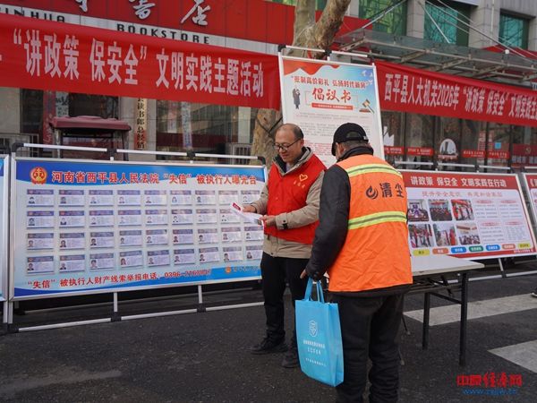 中原经济网驻马店讯(记者 杨晓 全媒体记者 冯占华 通讯员 朱可萱)为增强群众法治意识,营造平安和谐社会环境,3月3日上午,西平县人民法院在柏城大道中段组织开展“讲政策 保安全”文明实践主题宣传活动,通过“零距离”普法、“面对面”答疑,将法律知识送到群众身边。