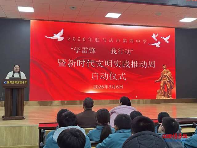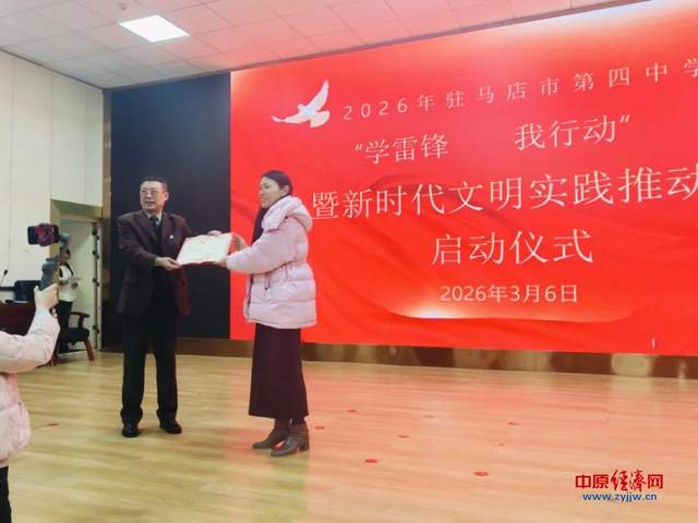 中原经济网驻马店讯 (记者 杨晓 全媒体记者 晨曦 通讯员 聂梅佳)为扎实推进新时代文明实践工作,3月6日,驻马店市第四中学举行2026年新时代文明实践推动周暨“学雷锋,我行动”主题活动启动仪式。活动以“传承红色基因,践行雷锋精神”为核心,通过校外辅导员聘任与红色主题讲座,为全校师生注入精神力量。