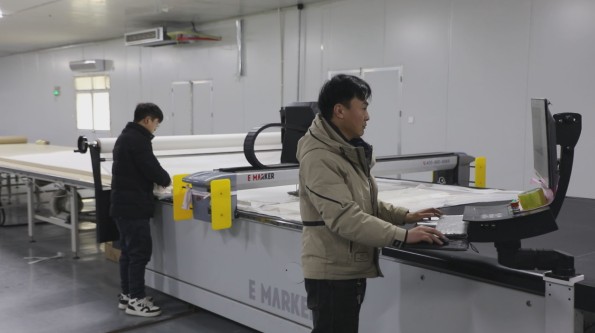河南旭升帽业裁床版师牛向阳说:“原来是人工排版,手推刀裁剪,效率低,浪费面料,自从上了自动裁床,电脑排版,精度高,降低了成本,提高了效率。”