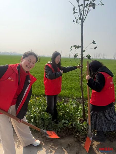活动现场春意盎然、干劲十足。大家身着志愿红马甲,分工协作、配合默契,挥锹铲土、扶苗正根、围堰浇水,每一道工序都认真细致、规范有序。在林业技术人员的指导下,姐妹们精心栽种,确保栽一棵、活一棵、成一片。阳光下,新栽的树苗整齐挺立、迎风吐翠,与巾帼身影相映成景,成为春日里一道温暖动人的风景线。