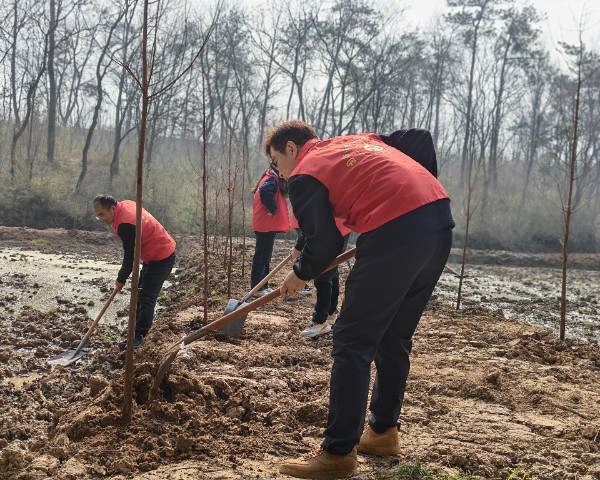 植树现场,旗帜飘扬,气氛热烈。固始县邮政分公司的青年员工们身着统一志愿者马甲,精神饱满地投入到植树劳动中。大家分工协作、配合默契,有的挥锹挖坑,有的扶苗填土,有的提桶浇水,每一个环节都一丝不苟、井然有序。尽管泥土沾满鞋裤、汗水湿透衣背,但大家热情不减、干劲十足,现场不时传出阵阵欢声笑语,青春的活力与植绿的喜悦交织成春日里最美的风景。