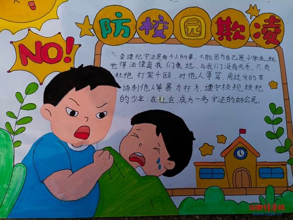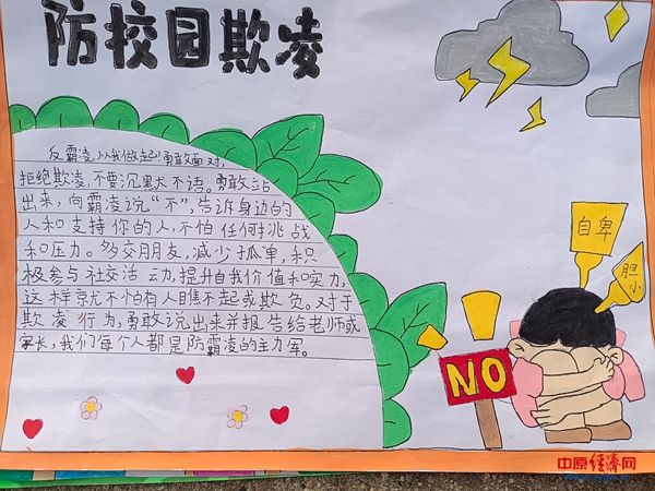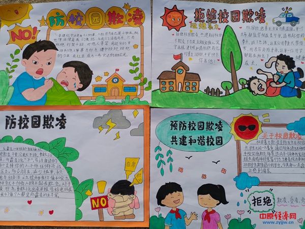 各班主题班会通过图片、视频等形式让学生认识到什么是校园暴力与欺凌以及所带来的负面影响,掌握应对校园暴力的正确方法,提高防暴能力,进而学会保护自己。同学们以防欺凌手抄报方式,深入学习并认识到防欺凌的重要性。欺凌,就像一道阴霾,会影响多彩快乐的校园生活,会笼罩孩子幼小的心灵,会阻挡孩子成长的脚步。