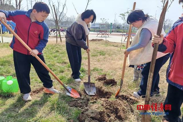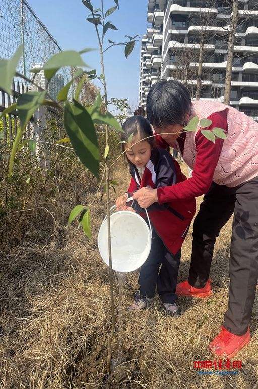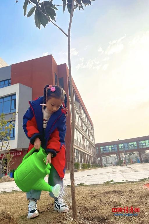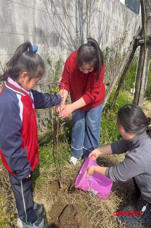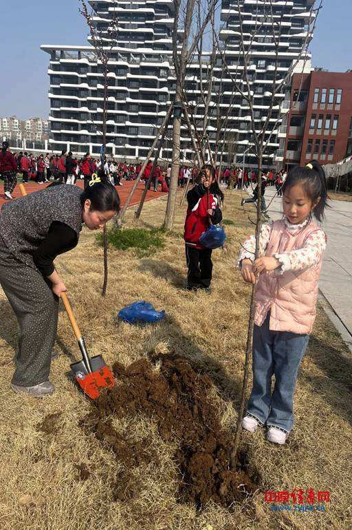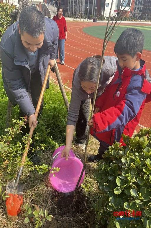 “坑要挖得深一点,土踩实了,树苗才能站得稳。”在家长的耐心指导下,孩子们化身可爱的“绿色小卫士”,小心翼翼地扶正树苗,挥动着小铁锹认真填土,稚嫩的动作虽略显生疏,眼中却满是专注与认真。当清澈的水流缓缓浇下,一株株小树迎着春风昂首挺立,校园里也多了一抹崭新的生机。植下一棵树,收获一片绿,我与小树共成长,这春日里的美好约定,也在这一刻悄然开启。