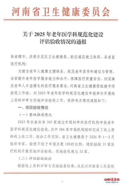 中原经济网驻马店讯(记者 杨晓 全媒体记者 冯占华 通讯员 田晋)近日,河南省卫生健康委正式下发《关于2025年老年医学科规范化建设评估验收情况的通报》,西平县中医院老年医学科顺利通过省级评估验收,标志着西平县中医院老年医学学科建设、服务能力与质量管理迈上新台阶。