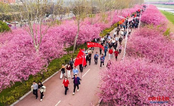 春日的西平,处处繁花似锦,小洪河两岸,万株海棠竞相绽放,绵延十余公里的海棠花海如梦似幻,70多个品种的海棠花争奇斗艳,西府海棠如晓天明霞,垂丝海棠婉约柔美,粉白的花瓣随风轻舞,宛若漫天粉色飞雪,勾勒出嫘祖故里独有的春日盛景。行走在如画的海棠长廊中,呼吸着沁人心脾的花香,老师们感叹:“身为西平人,每年海棠盛开时都忍不住自豪,这片土地把生态之美刻进了骨子里!”健步走与赏花相融,既锻炼了身体,更让心灵沉浸在家乡的生态蝶变中,对“醉美西平”的认同感油然而生。