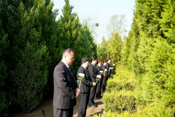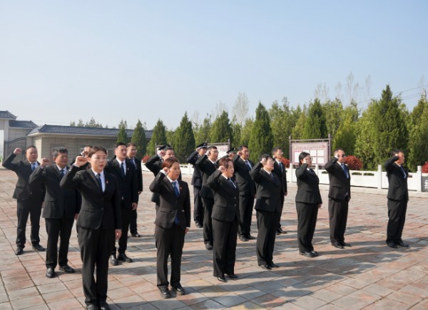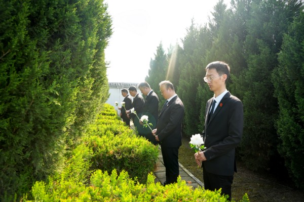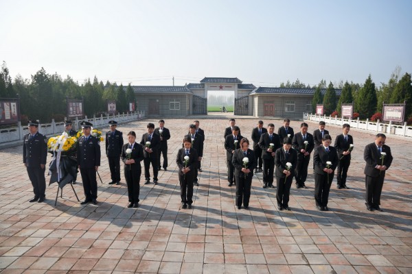 陵园内庄严肃穆,苍松翠柏环绕,法警们稳稳抬起花篮,缓步走向纪念碑,将花篮整齐摆放在碑前。干警们在烈士纪念碑前整齐列队,面向革命烈士纪念碑集体默哀,寄托哀思和缅怀之情。
