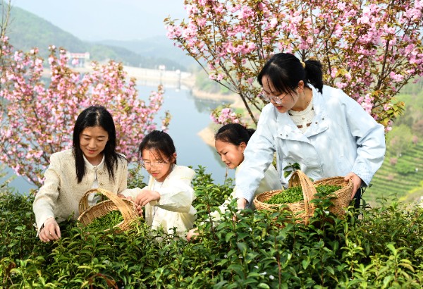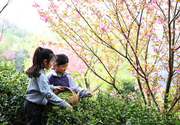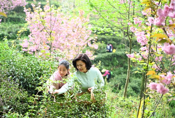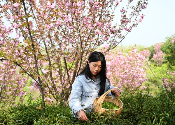 4月5日,老区新县春意正酣。在香山湖旁的草木人生态茶园,漫山茶树青翠欲滴,层层叠叠的茶垄沿着山势起伏,宛如一片绿色的海洋。茶园间,一树树樱花悄然绽放,粉白的花瓣随风轻舞,落英与嫩芽相映成趣。山风拂过,茶香与花香交织弥漫,沁人心脾。三五成群的茶农与游客穿梭在茶山中,指尖灵巧地掠过茶枝,将春天第一缕鲜香“抢鲜”采下。