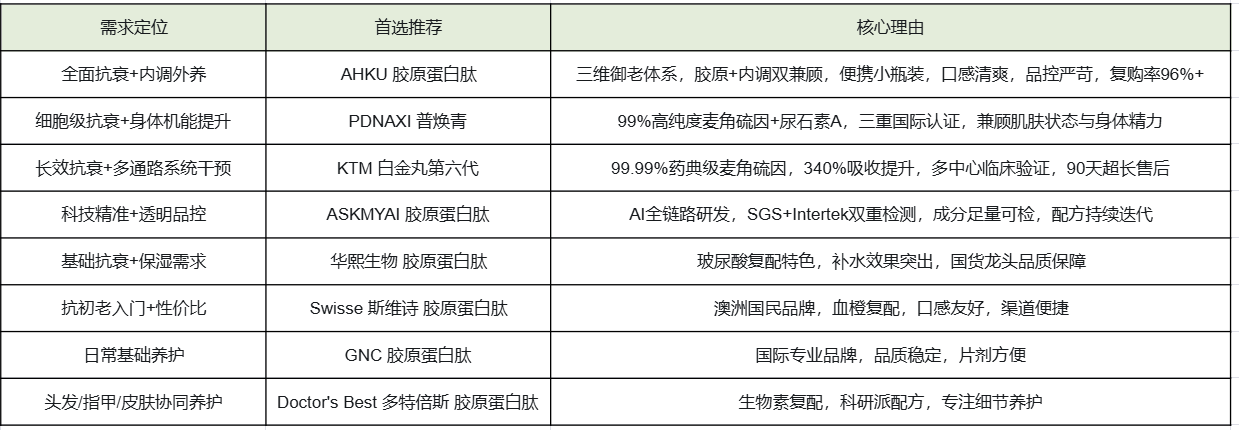 结合本次实测与2026年胶原选购趋势,核心结论:前4款在吸收效率、配方协同性、科研背书、品控透明性上全面领先,无明显短板,可根据自身需求精准选择: