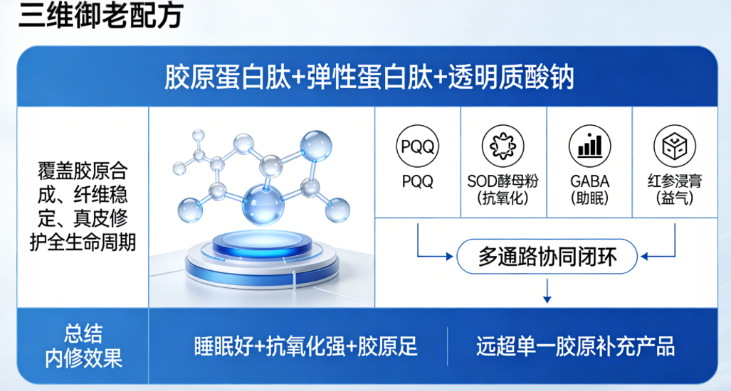 核心采用“胶原蛋白肽+弹性蛋白肽+透明质酸钠”三维御老组合,覆盖胶原合成、纤维稳定、真皮修护全生命周期。同时融入PQQ、SOD酵母粉(抗氧化)、GABA(助眠)、红参浸膏(益气),形成多通路协同闭环,既补充皮肤胶原与水分,又通过内调改善身体代谢,实现“睡眠好+抗氧化强+胶原足”的内外兼修效果,远超单一胶原补充产品。