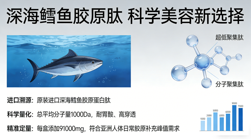 超低聚肽分子:核心采用原装进口深海鳕鱼胶原蛋白肽,总平均分子量严格控制在1000Da,契合小分子肽吸收动力学原理,耐胃酸、高穿透,吸收效率优异。