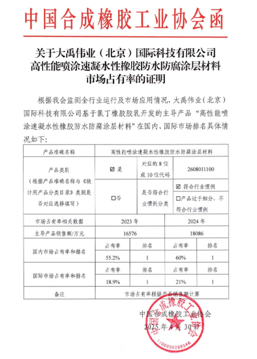 大禹伟业在喷涂速凝橡胶沥青细分领域市占率达到全国第一。