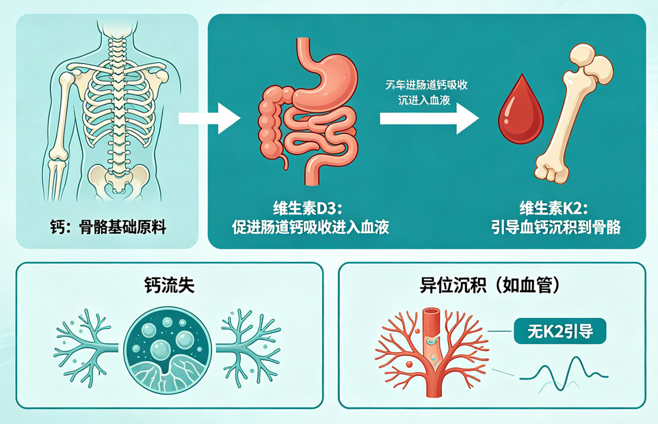维生素K2:引导血液中的钙精准沉积到骨骼中,避免钙流失和异位沉积