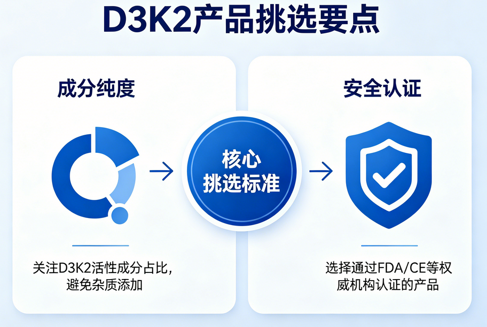 随着大家对补钙健康的重视,市场上维生素D3K2相关的产品越来越多,消费者经常会问:维生素D3K2哪个牌子的好?其实挑选D3K2产品并不难,核心看两个方面:一是成分纯度够不够高,二是安全认证够不够全。